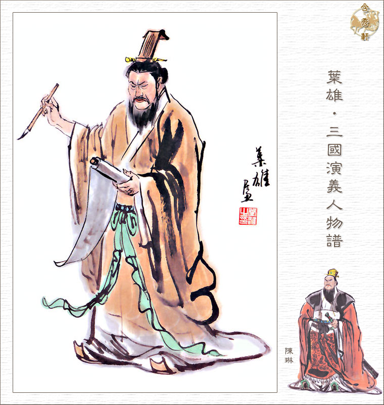 陈琳,广陵洪邑人,三国时曹魏文臣,亦是著名文学家、檄赋家。陈琳前为何进主簿。何进欲尽诛宦官,便召四方猛将,使他们引兵向京城,以恐吓太后;陈琳以此计百害无利,向何进加以劝谏,然而何进不肯纳其言,最终因以取祸。于是陈琳避难于冀州,袁绍便使其负责掌典文章之事。建安五年,袁绍伐许都,向曹操宣战,使陈琳作檄以告刘备,言曹操为人没有德行,不堪依附,宜归于袁绍。不久袁绍败于官渡。绍卒后,二子谭、尚交争欲得崔琰为臣。崔琰称疾固辞,竟因此获罪,被幽禁下狱,幸赖陈琳及故豫州刺史阴夔营救方才得免。后袁尚为曹军所围,袁尚惊惧,遣阴夔及陈琳往曹营乞降,曹操不许,反加紧进围。袁氏败亡后,陈琳归顺曹操。曹操深爱其才,对于陈琳的作品,有时曹操竟不能为之增减一字。建安二十二年,陈琳逝世。今有《陈记室集》。