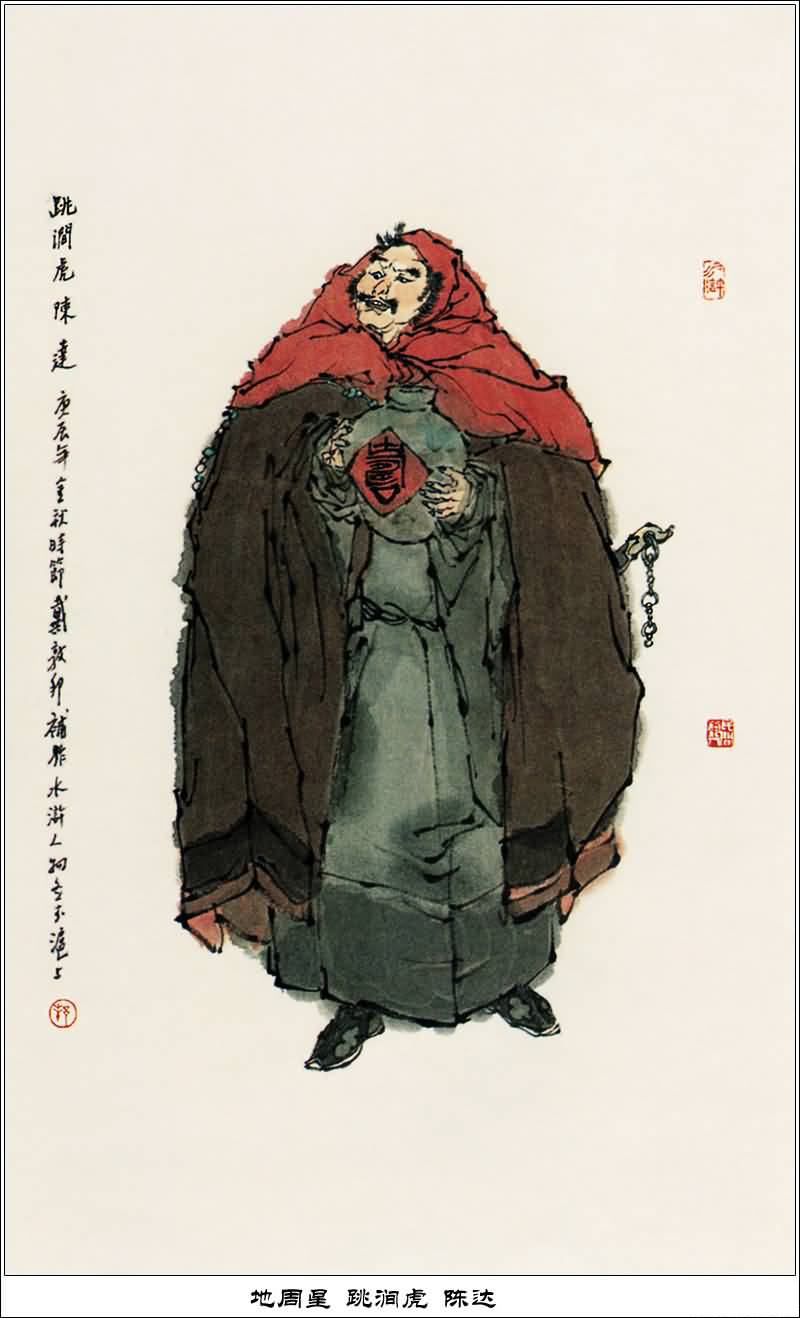 陈达,邺城人氏,使一条出白点钢枪,江湖人称"跳涧虎"。早先同朱武、杨春在少华山落草为寇。陈达与朱武、杨春攻打史家庄时,陈达被史进活捉,朱武、杨春请史进将他们三个头领一同送官治罪。史进见他们义气深重,便放了陈达。后他同史进一起,在梁山军马闹华州时归顺了梁山,为梁山马军小彪将兼远探出哨头领第十三名,是梁山第七十二条好汉。
