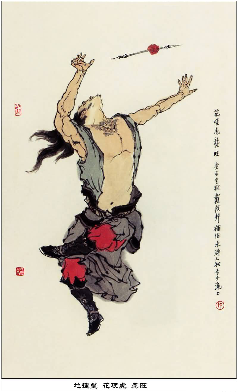 龚旺原来是东昌府猛将张清手下的副将,外号"花项虎",浑身刺有虎斑,脖子上刺着虎头,在马上会使飞枪。卢俊义攻打东昌府失败,宋江前去支援,龚旺被林冲、花荣活捉,归降了梁山,封为步军将校第十四名,排梁山第七十八条好汉,征讨方腊时战死。