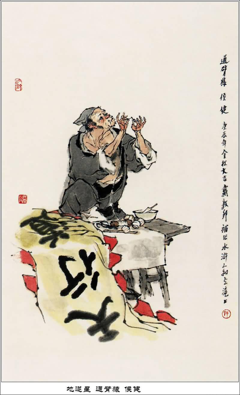 侯健,祖居洪都,做得一手裁缝好活,飞针走线,技艺高超。爱使枪弄棒,曾拜薛永为师。长得黑瘦轻捷,人唤"通臂猿"。宋江等人捉拿黄文炳时,侯健正在黄文炳家做衣服,便与薛永一起,做了内应,杀了黄文炳一家。入梁山后,他负责制作旌旗袍袄等军服,是梁山第七十一位好汉。征讨方腊时,侯健战死。