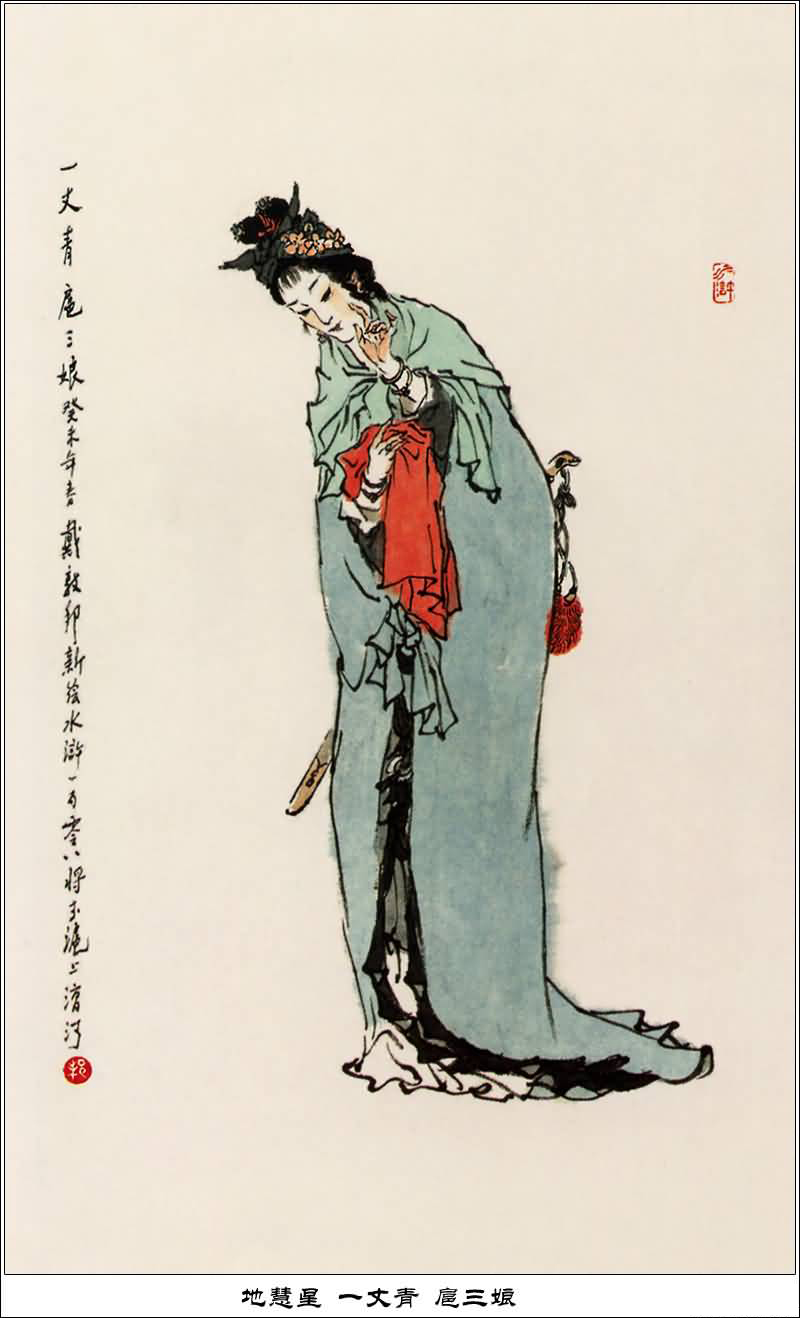 一丈青扈三娘是梁山第一女将,武艺高强,一双刀神出鬼没,更有用绳套的绝技,阵前用绳套捉人十分厉害。宋江攻打祝家庄时,扈三娘首战便捉了"矮脚虎" 王英。扈三娘后被林冲所捉,由宋江主婚与王英成了夫妻。同掌梁山三军内采事,是梁山第五十九条好汉。随宋江征讨方腊时,王英被南军将领郑彪一枪挑死,扈三娘急去救应,被郑彪掷来的钢砖打中门面而死。