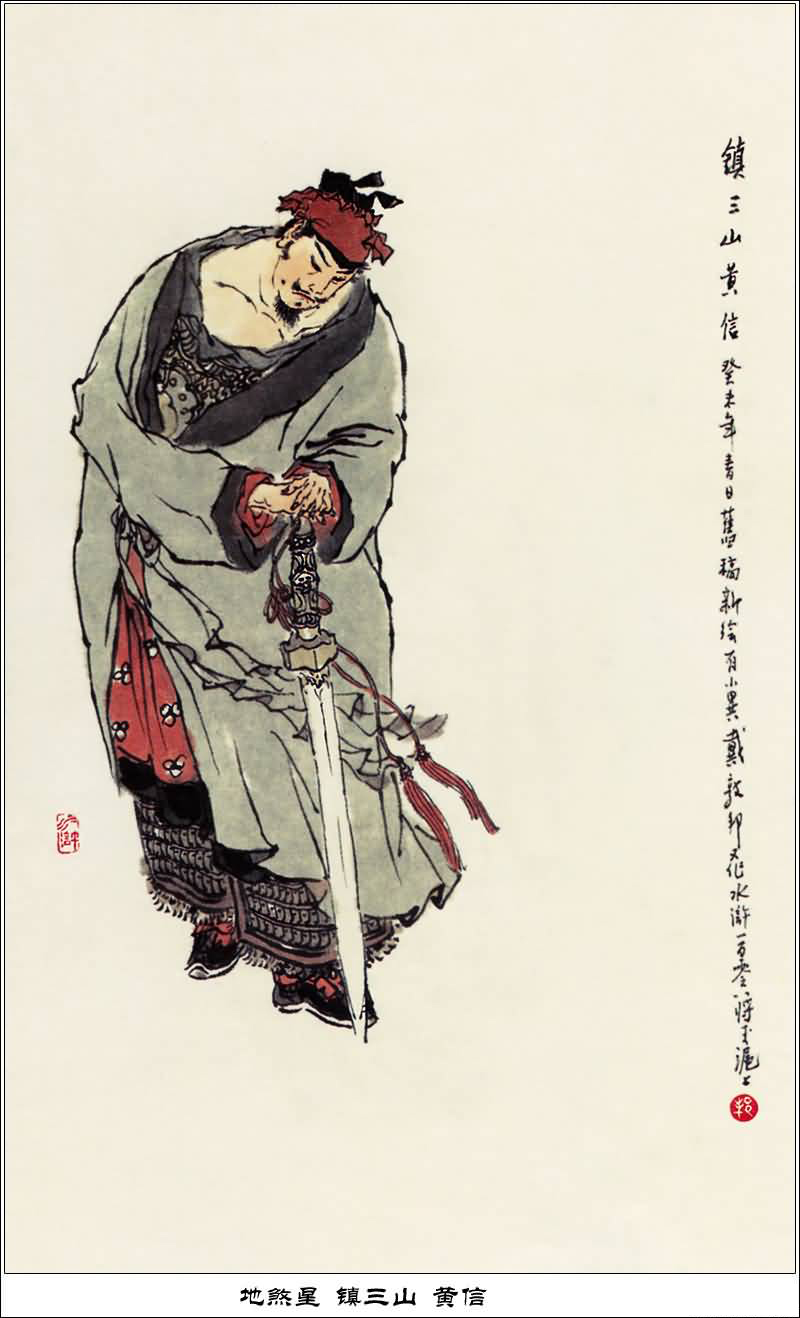 黄信原是青州知府慕容彦手下的兵马都督,一身好武艺。清风寨刘高捉了宋江,黄信来提人,又设计捉了花荣,押往 青州时被燕顺、王英、郑天寿围住,黄信 打不过逃走。秦明被捉投降后,劝说黄信