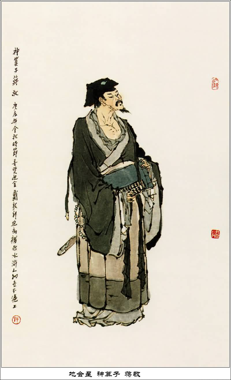 蒋敬,人称"神算子"。潭州人,落科举子,弃文就武,稍通书算,颇有谋略,亦能布阵排兵。在黄门山与欧鹏等人落草。宋江浔阳楼写反诗被捉,梁山好汉劫法场,救了宋江、戴宗,路过黄门山时,蒋敬与欧鹏、马麟、陶宗旺等一同归降梁山。排名梁山第五十三条好汉,为山寨掌管监造诸事十六头领之一。专管考算钱粮支出纳入。受招安后,蒋敬被封为武奕郎兼都统领。