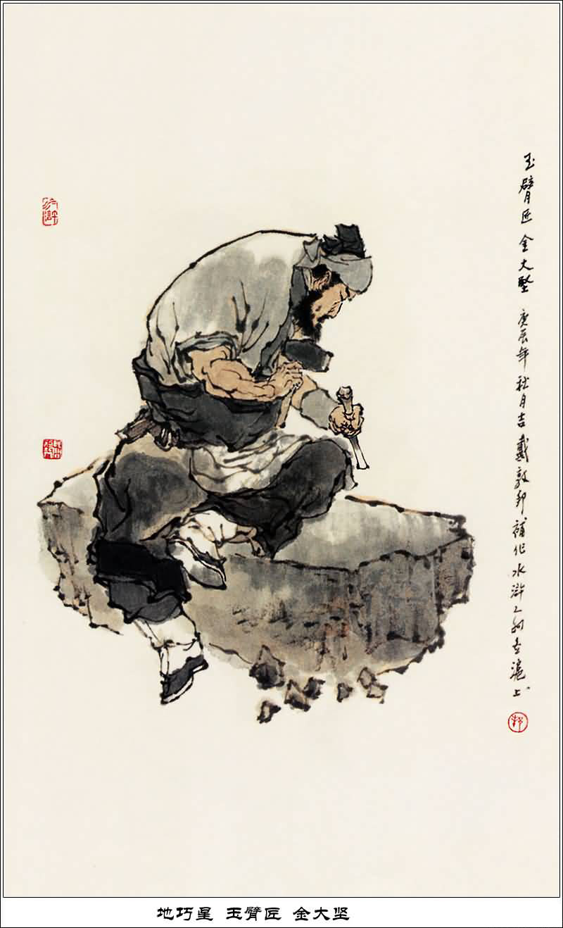 金大坚,着名金石雕刻家,善刻当时的苏、黄、米、蔡四种字体,济州人氏。宋江被捉关在江州,吴用献计,把圣手书生萧让和金大坚请上梁山,金大坚刻了蔡京的假印,用来骗蔡京。没想到刻的图章是蔡京的名讳图章。哪有老子给儿子写信,盖自己名讳图章的呢?此事被黄文炳看破,险些断送了宋江、戴宗的性命。金大坚同萧让一起,都是梁山文职将领,专管造兵符印信,排梁山第六十六位英雄。征讨方腊时他被圣旨召回御前听用。