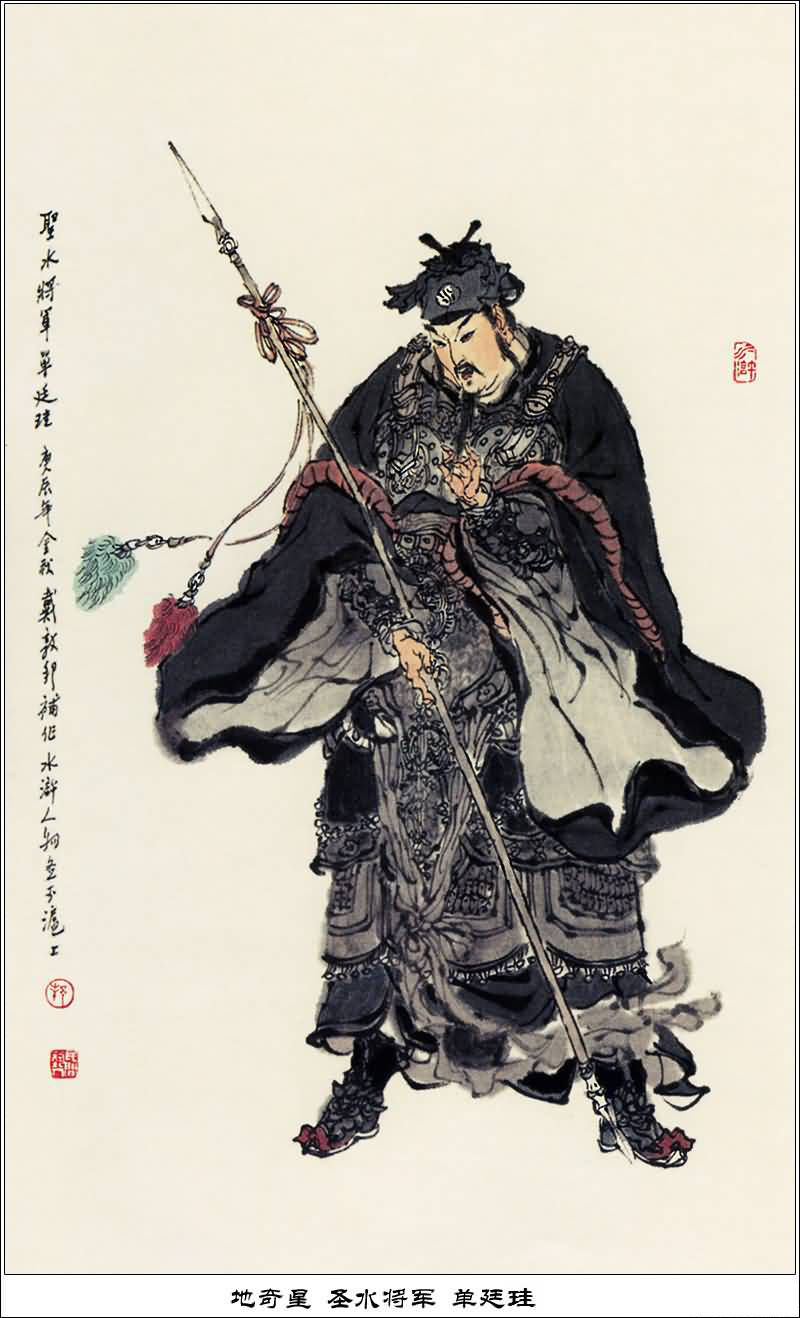马追赶,举枪便刺,关胜奋起神威,用拖刀计将单廷珪拍下马后活捉,单廷珪归降梁山。与林冲、董平、魏定国把守梁山正西旱寨。征讨方腊时阵亡。
