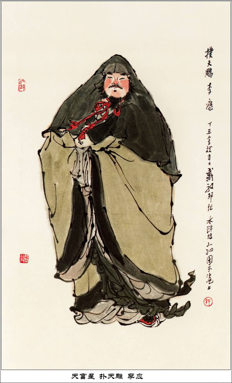 梁山泊第十一位好汉,同柴进一起掌管钱粮财物。李应原是李家庄庄主,江湖人称"扑天雕",使一条浑铁点钢枪,背后藏有五口飞刀,能够百步以内伤人。时迁偷吃了祝家庄酒店一只公鸡,惹出事来,被祝家庄人马捉拿。杨雄、石秀求李应搭救时迁,祝家庄祝彪不给李应面子,李应和祝彪交战,被暗箭所伤。宋江攻下祝家庄,李应却不肯投奔梁山。后来李应被知府捉拿,多亏宋江率兵马相救,李应终于上了梁山。受招安后,李应被封为中山府郓城都统制。
